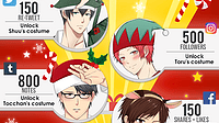 Get 150 RTs on Twitter (pinned post): unlock Shuu's silly tree-hat costume! Get 500 followers on Instagram : unlock Toru-chi's cute elf costume! Get 800 notes on Tumblr (latest post): unlock Toccha...
